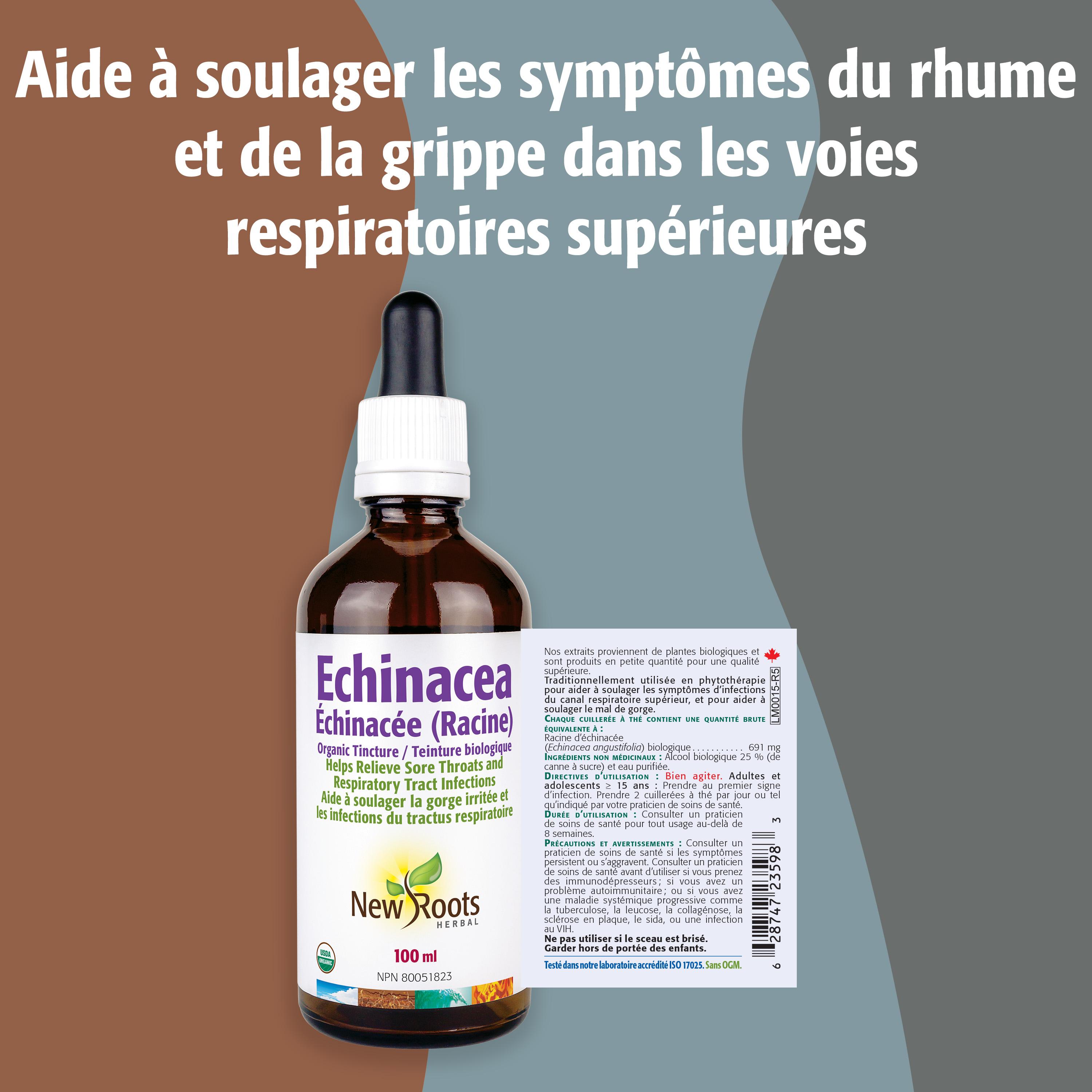 New Roots Herbalâs Echinacea Root is a premium organic tincture crafted from superior-quality Echinacea angustifolia roots to provide robust immune support. This potent extract is designed to bolster your bodyâs natural defenses and promote overall respiratory wellness, ensuring you stay resilient during seasonal transitions. When cold or flu symptoms take hold in your upper respiratory tract, this versatile liquid formula offers relief to help in your recovery. It is specifically formulated to soothe sore throats and assist in relieving more stubborn respiratory tract infections. For a comforting experience, the tincture can be easily added to warm water or other soothing beverages, making it a seamless and natural addition to your wellness routine when you need it most.