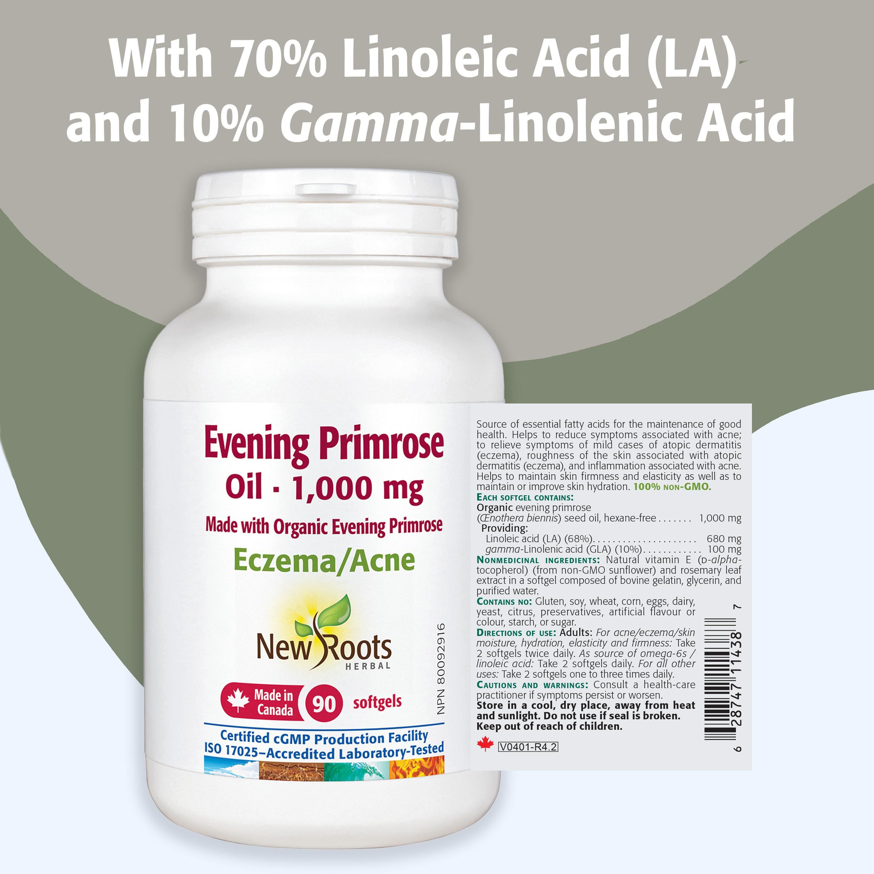 New Roots Herbal’s Evening Primrose Oil is available in 500 mg or 1000 mg softgels.