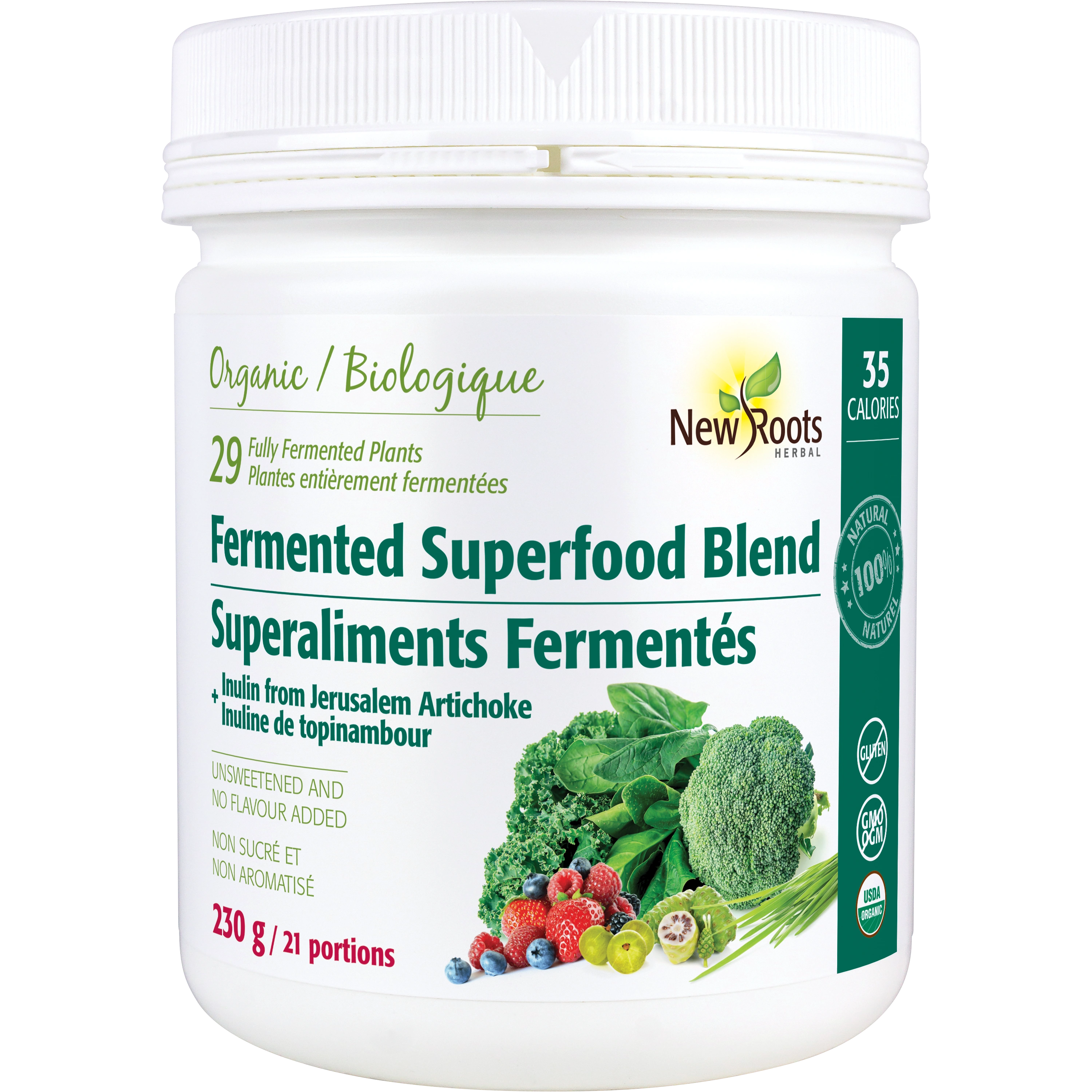 Fermented Superfood Blend is a mosaic of naturally occurring nutrients from a complete roster of vegetables, fruits, and time-honoured botanicals. Our formula features cranberries, blueberries, chlorella, spirulina, ginger, turmeric, and cruciferous vegetables among its 29 fermented plant-based sources. Fermentation strips unwanted sugars and carbohydrates to enhance the biological activity of native nutrients in a convenient, concentrated powder. Inulin (sourced from organic Jerusalem artichoke) completes the blend to further amplify nutritional gains and gut health status.