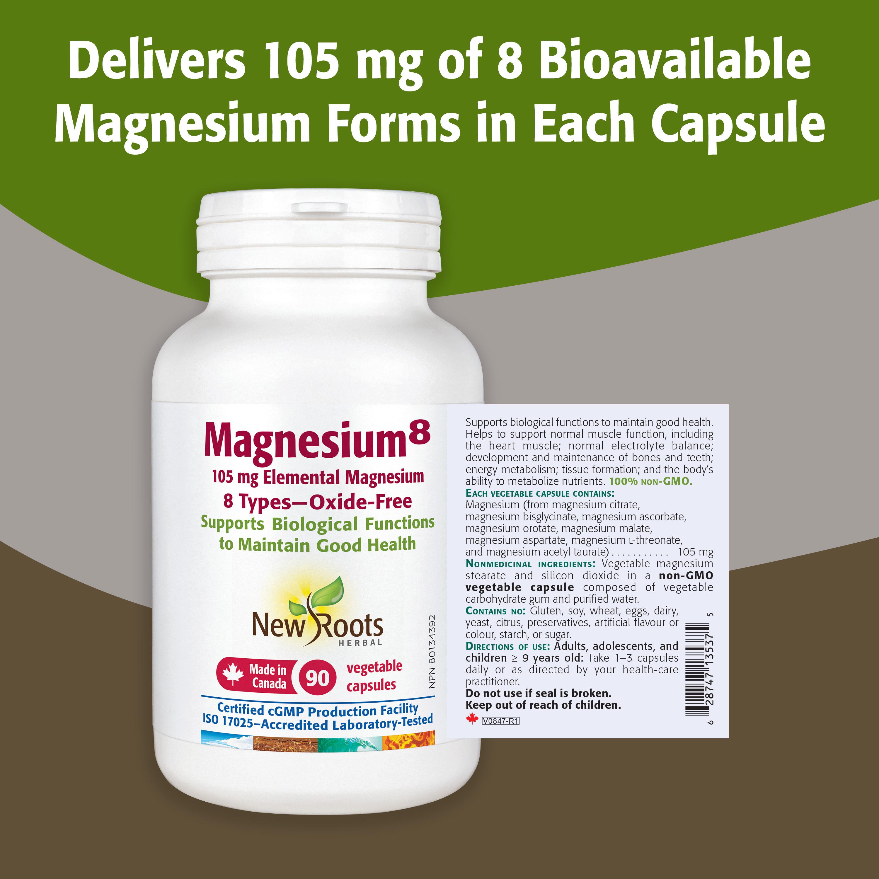 Each capsule contains 105 mg of elemental magnesium from eight sources.