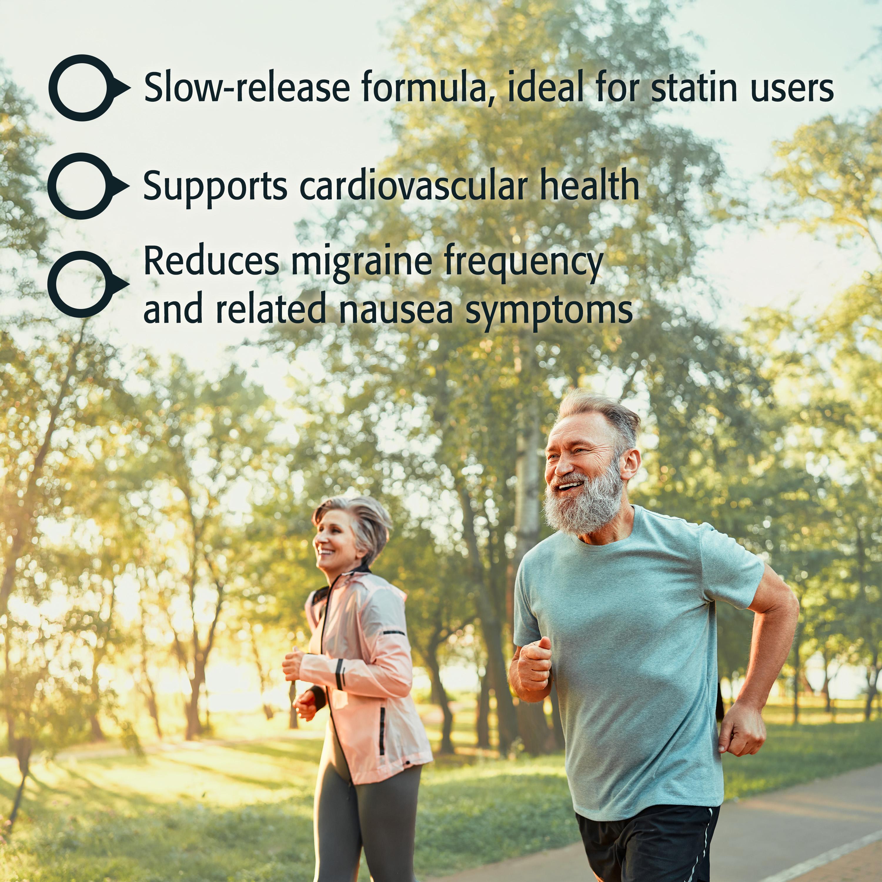 Slow-Release CoQ10 is an excellent therapeutic option for an age-related decline in production of this critical compound. Its many benefits include promoting cardiovascular wellbeing, along with reducing the frequency of migraine headaches. It also can be employed to counteract impaired coenzyme Q10 production as a side effect of prescription statin drugs.