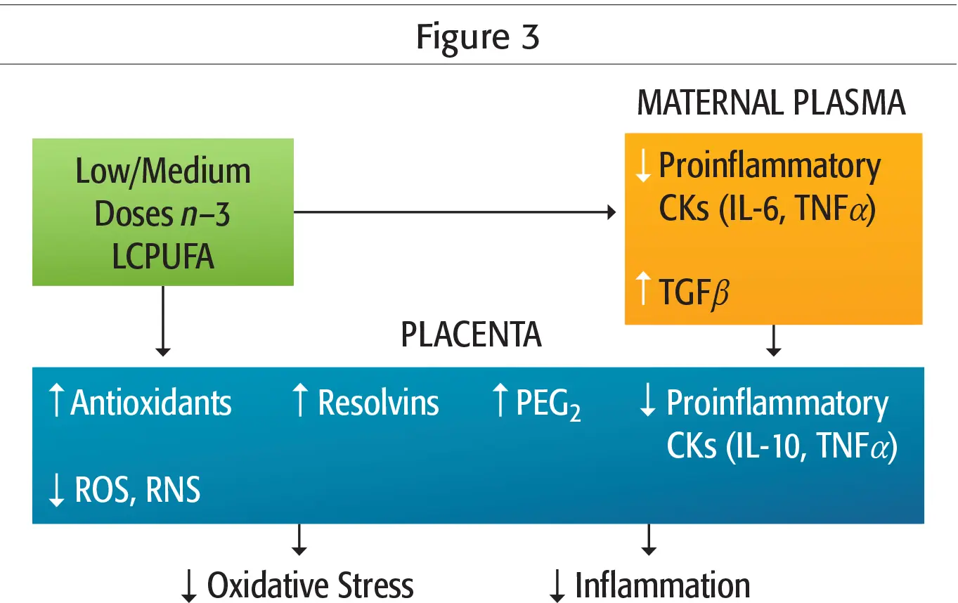 Science and nature are not always accurate, and the efficiency of physiological processes of the body never reaches 100%. As we have seen, about 25% of ALA is catabolized as CO2 to produce energy, and therefore will not be available for producing EPA and DHA omega-⁠3s. Also, in women, only 20% of ALA is converted into EPA, and 9% into DHA. Although these figures vary according to each person’s biochemical individuality, they show the importance of supplementing with EPA and DHA omega-⁠3s. For fertility, pregnancy, and breastfeeding, omega-⁠3 fatty acids are great nutrients, as are probiotics and vitamin D3, which promote vascular development of the endometrium and intrauterine blood flow; and reduce the risk of miscarriage, premature delivery, and complications. Indeed, omega-⁠3 decreases placenta PG2 through EPA and ADH omega-⁠3 derivatives including, among others, recently discovered resolvin and protectin anti-inflammatories (Figure 2 and Figure 3).