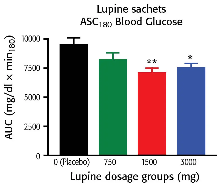 Another study evaluated the effect of lupine protein and one of its active constituents, γ-⁠conglutin, on blood glucose control.[9] In a placebo-controlled trial of 15 healthy participants, one of three doses of lupine protein were administered, followed by carbohydrate loading. Blood glucose was measured over the next three hours. Compared to placebo, lupine protein doses of 1.5 g and 3.0 g (but not lower doses) were associated with lower increases in blood glucose associated with carbohydrate loading. This is depicted in Figure 1.