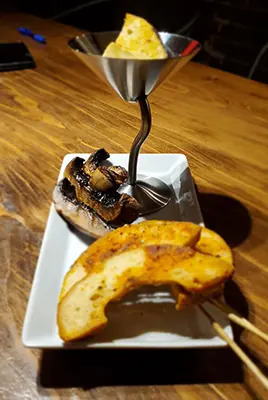 Cut portobello cap into ½-inch slices, pierce with satay sticks, lightly brush with olive oil, then char on grill. Serve with bagel chips, toast points, or other dipping preference.